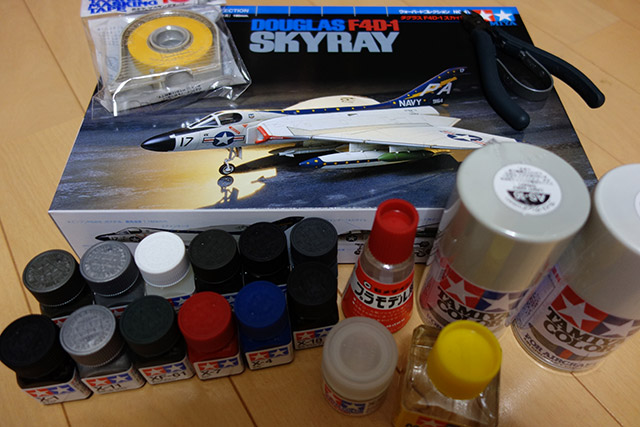 プラモデルといえばタミヤ。タミヤのサイトに行っていろいろ漁っていると、1/72 ウォーバードというシリーズがあって、そのなかで「スカイレイ」というアメリカの艦上戦闘機が可愛いらしかったので購入。ついでにニッパーや塗料なども色々出向いて購入しました。
