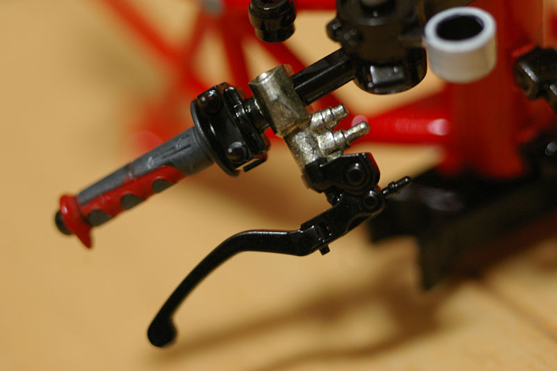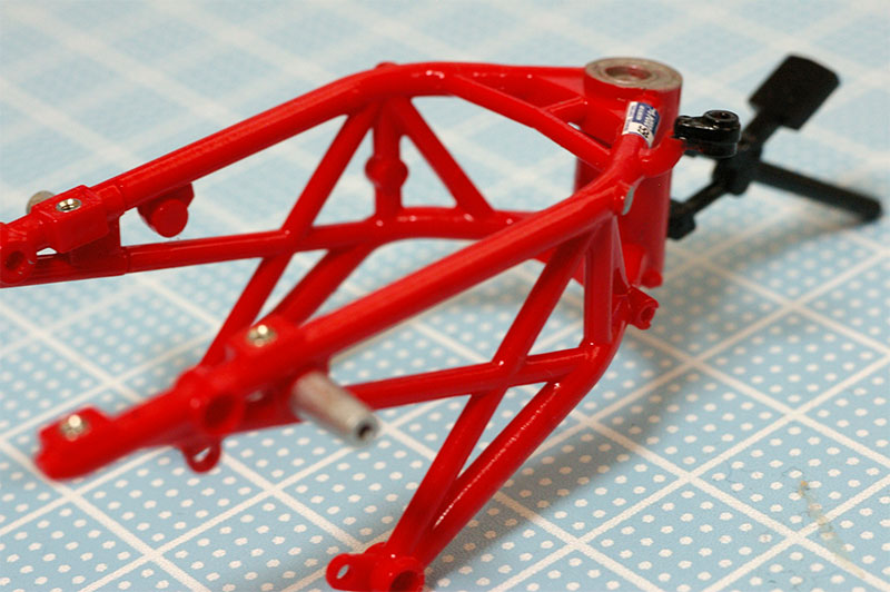 アスクルスライダーとステアリングの軸の部分をそれぞれ塗って、スライドマークを貼り付けて、クリアを吹いてフレームは出来上がりです。