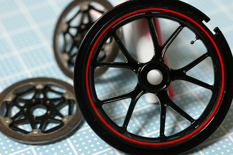 ブレーキディスクはガンメタ(X-10)とメタリックグレイ(XF-56)の塗り分けなのですが、これがまた細かくてなかなかキレイに出来ず、ところどころ歪んでの仕上がりになってしまいました。しかもアクリル塗料だとあまり両者の差が分からず、試しにガンメタだけエナメルに変えて塗装してみると、ハッキリと濃い色が出ます。エナメルのほうが粒子も細かく発色も良いようですね。これからはエナメルも積極的に使っていこうかな。
