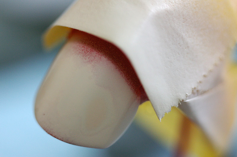 右写真はペーパ掛けをしたら下地が出てしまったので、急に色が変化しないようにグラデーション状にに塗装のうえからサフを吹いたところです。塗装の上からサフを吹いていいのかセオリー的に分からなかったのですが、これも経験と思ってやってみました。