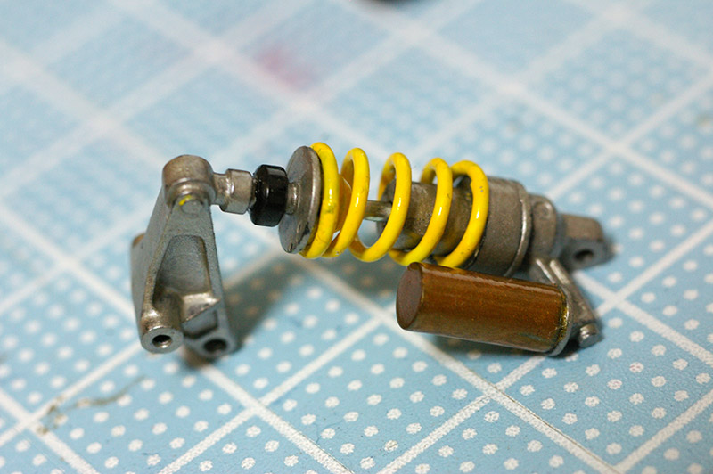 黒い下地に黄色を塗らないといけないのでサフを吹いたのですが、バネの部分は組み立て時にポロポロとサフごと剥離してきてしまい、ちょんちょんと黄色を細筆で置いてタッチアップしました。拡大するとアラが見えまくりですね(>_<。