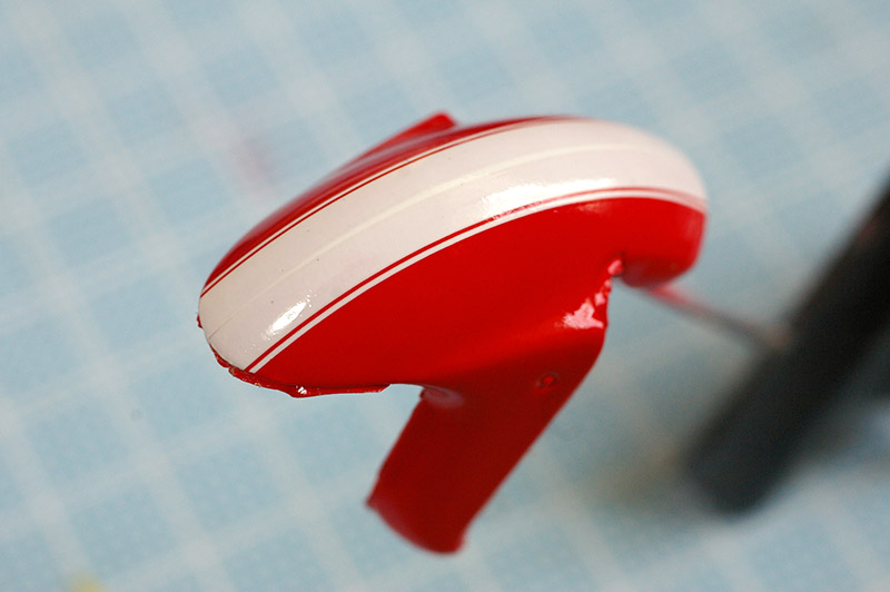 マッドガード部分は確かタミヤのスプレーはエナメル溶剤で拭き取れてしまう事例があるようなので、エナメル溶剤をレンズ用のペーパに染み込ませて乾ききる前に拭き取ったら、なんとかリカバリーできました。